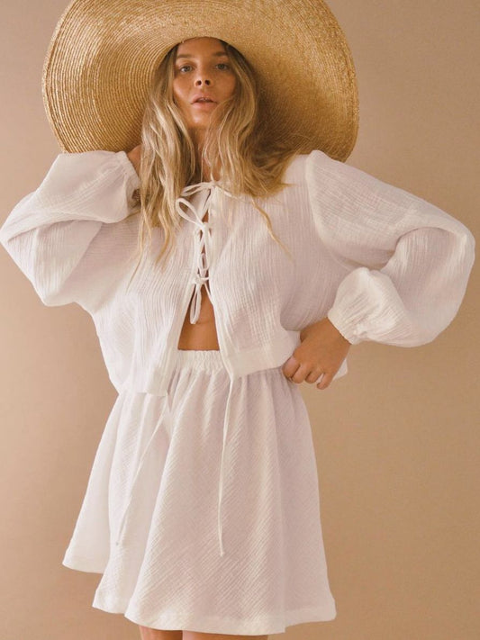 Camillen - Conjunto Romántico de Dos Piezas Short de Cintura Alta y Top Manga Larga Primavera Verano Para Mujer