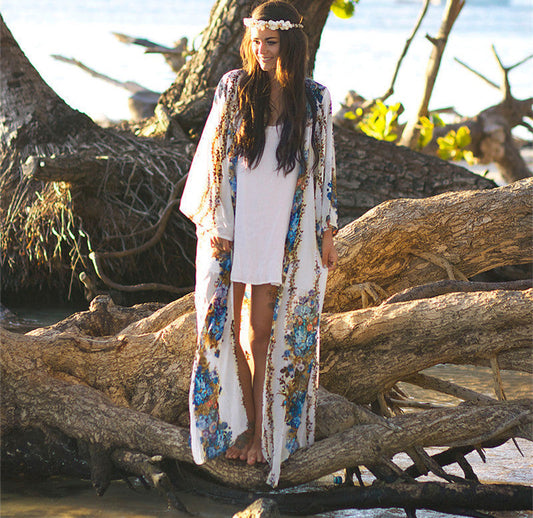 Kimono largo fluido con estampado étnico colorido para mujer – INDRA