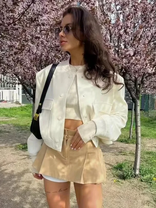 XÈNIA - Chaqueta bomber corta con cuatro bolsillos frontales y diseño minimalista para mujer