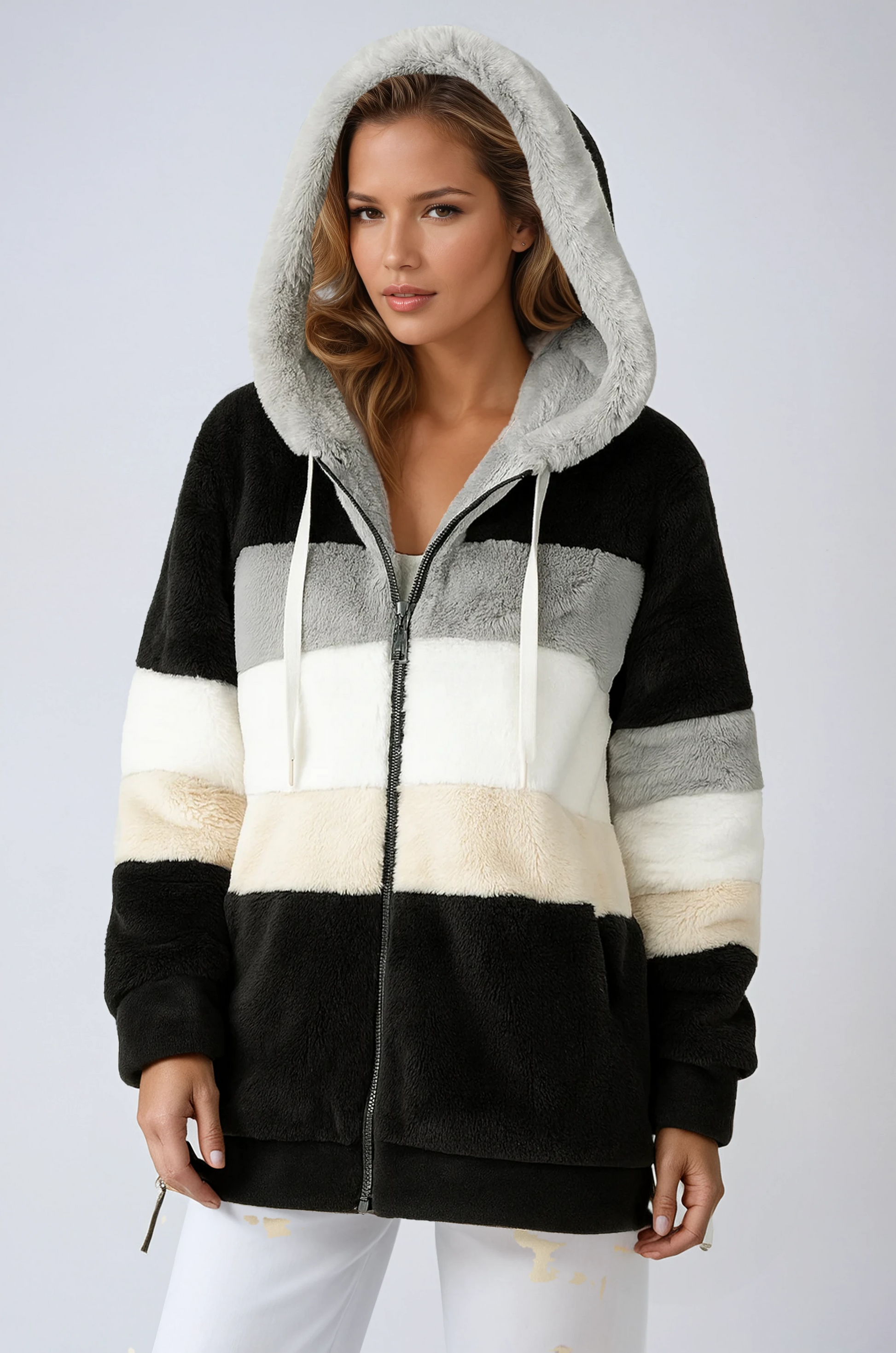 Abrigo de peluche para mujer con capucha y diseño a rayas – SELVINA