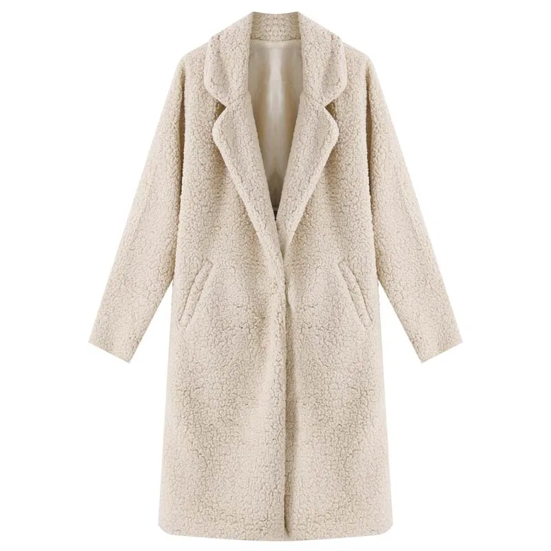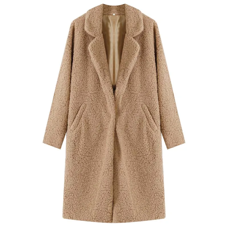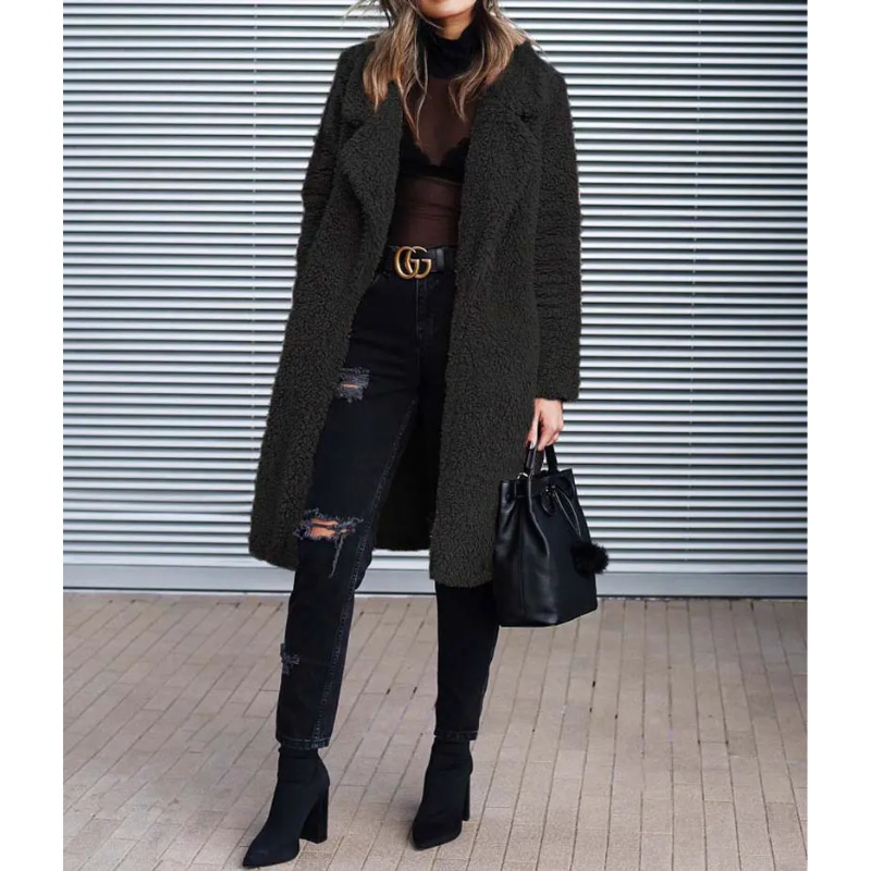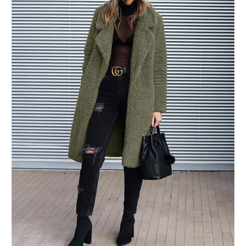 - Estilo: Abrigo largo de teddy con solapa