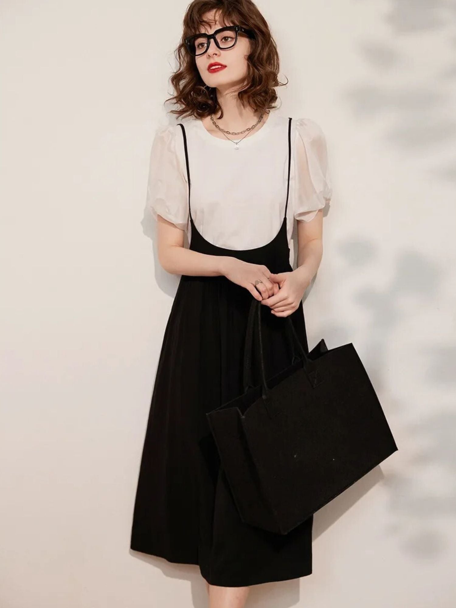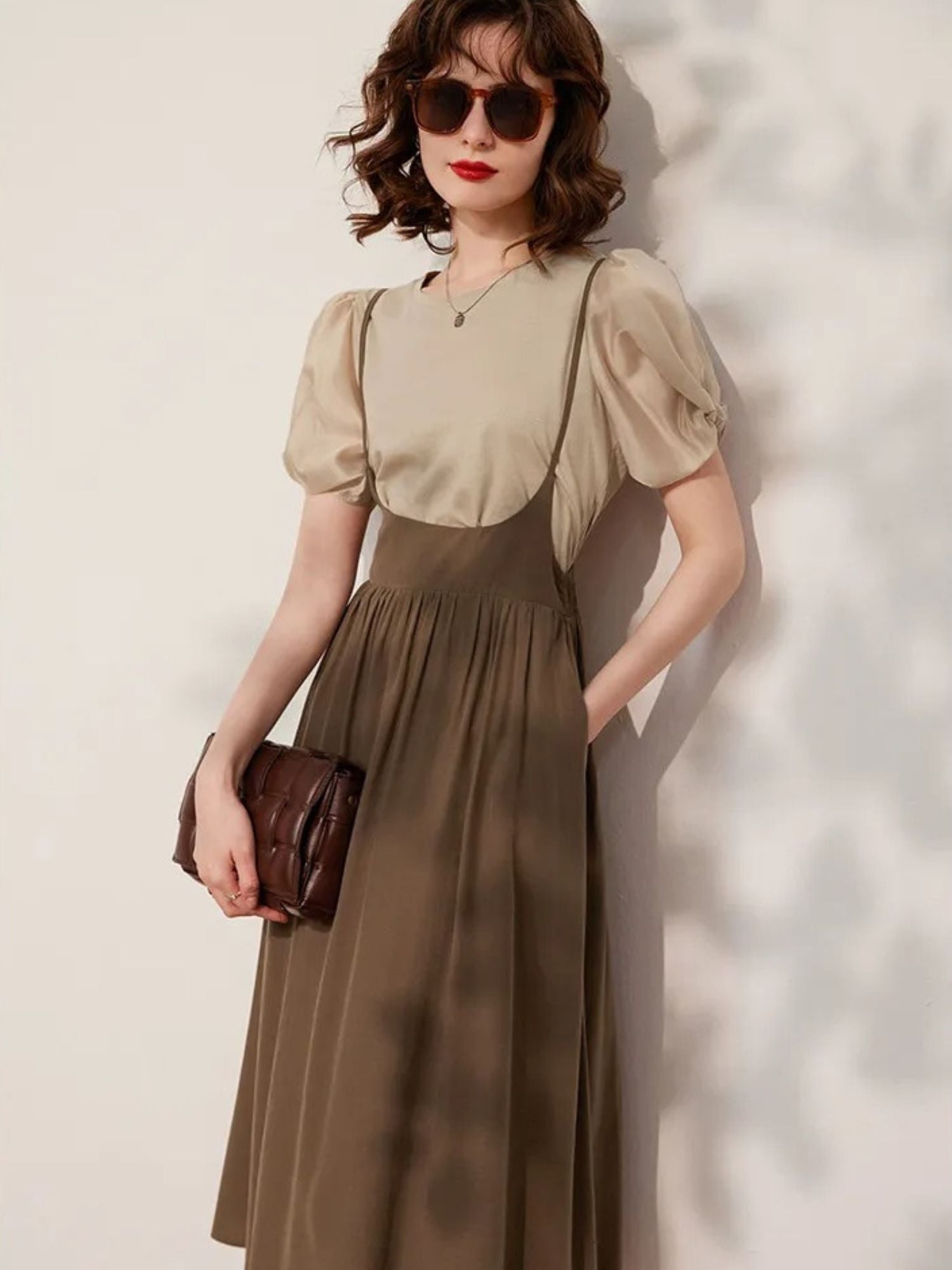 El top con mangas abullonadas aporta volumen y un aire romántico, mientras que la falda midi crea una silueta fluida y favorecedora.