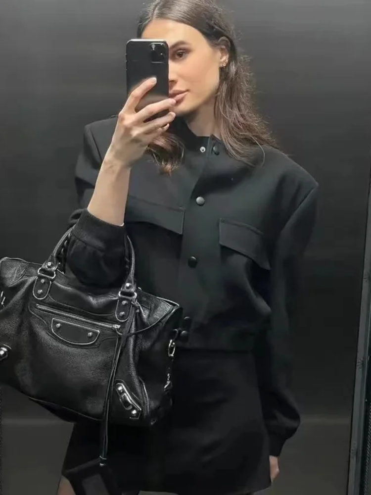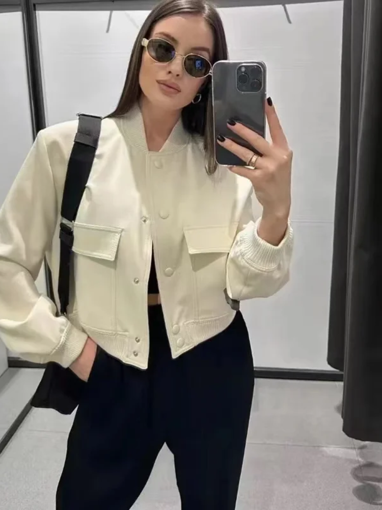 - Estilo: Chaqueta bomber corta con cierre de botones y bolsillos frontales