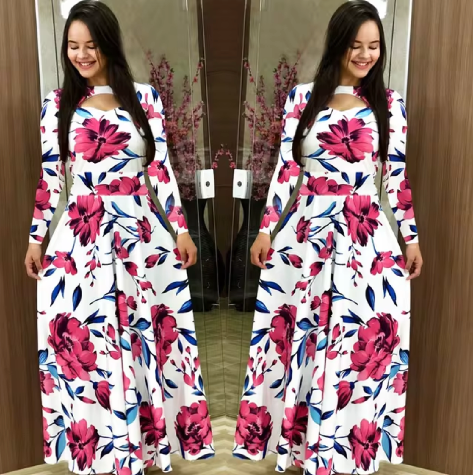 LIA - Vestido maxi de manga larga con estampado floral para mujer