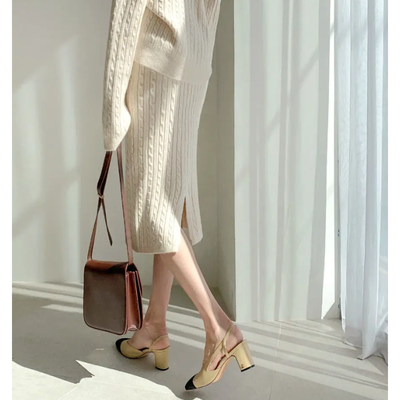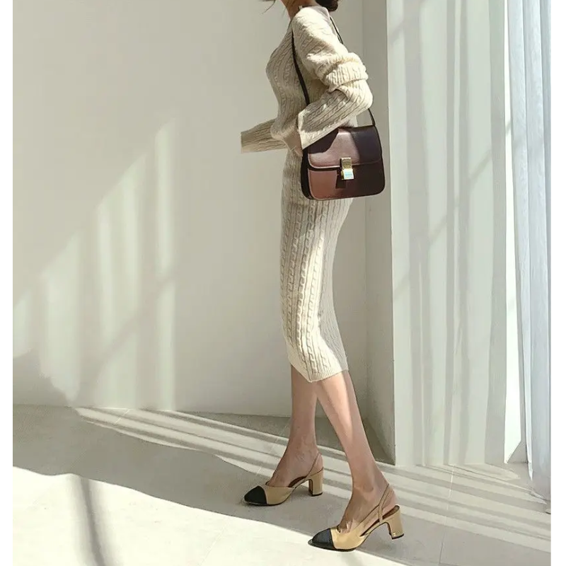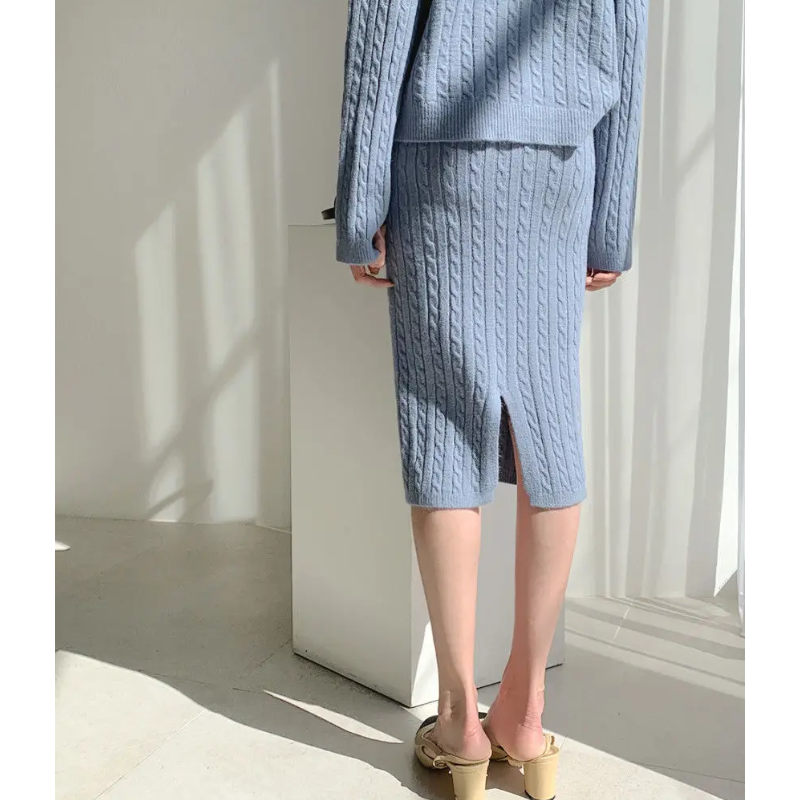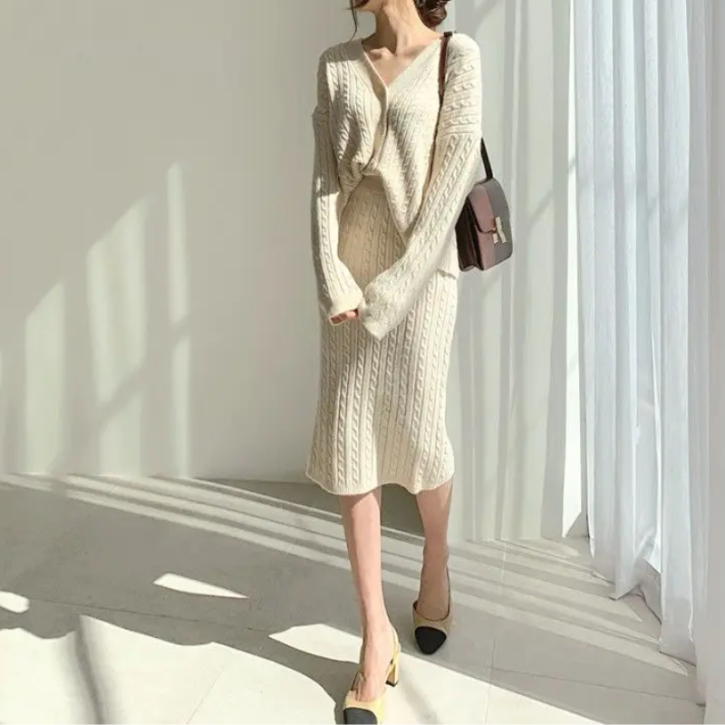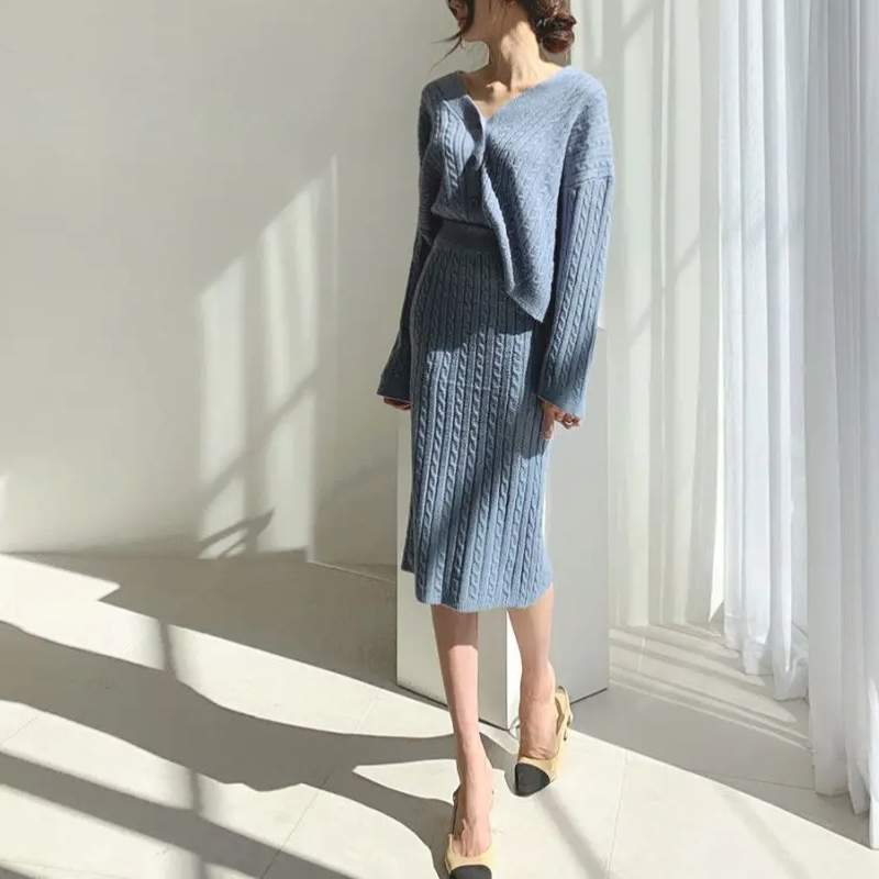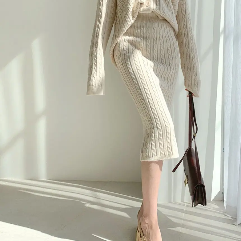 - Estilo: Conjunto de suéter de manga larga y falda de punto