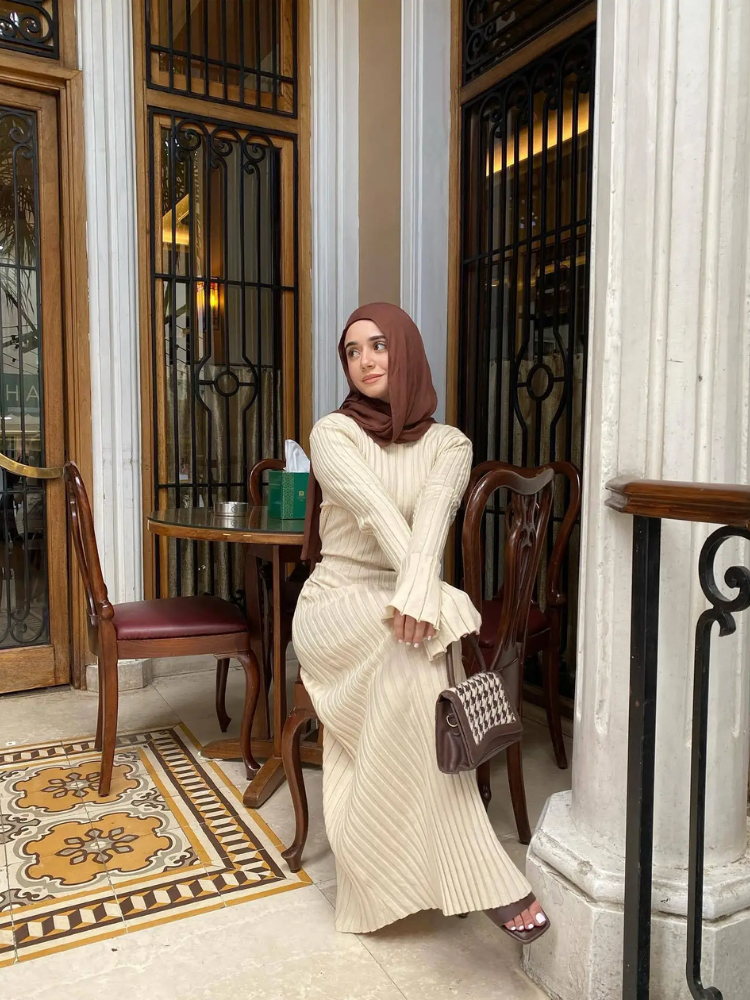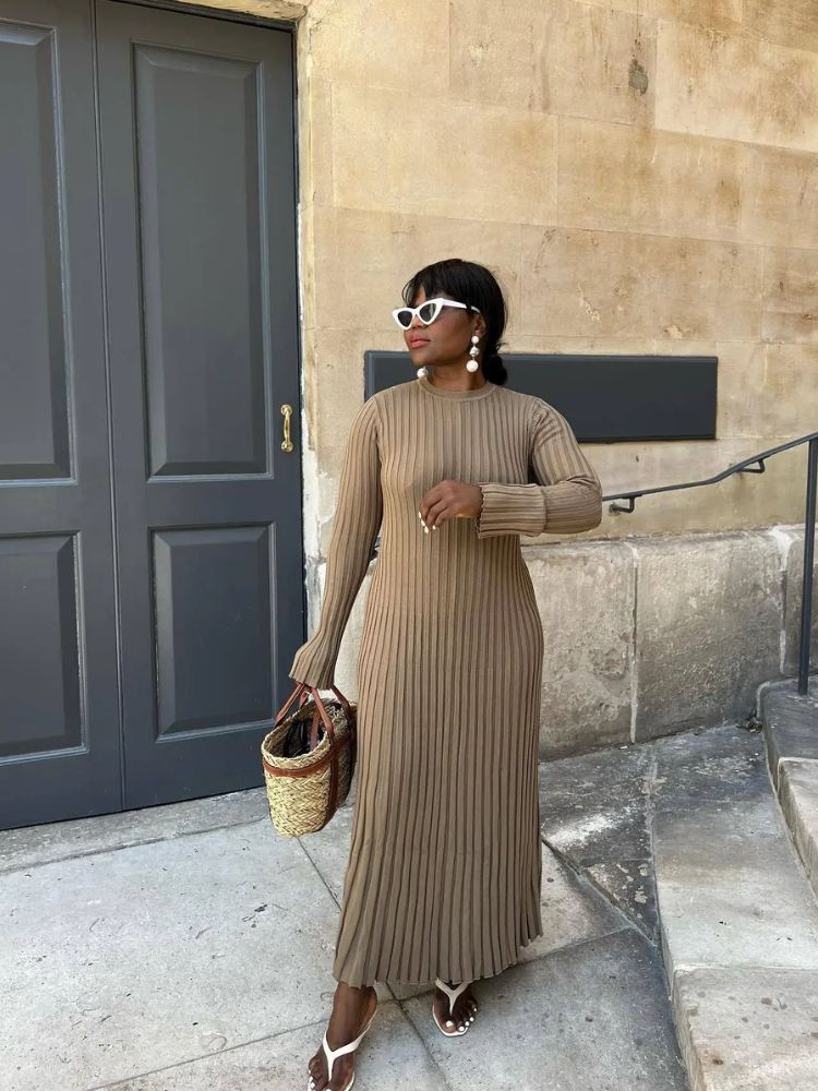 - Estilo: Vestido largo de punto ajustado con diseño plisado