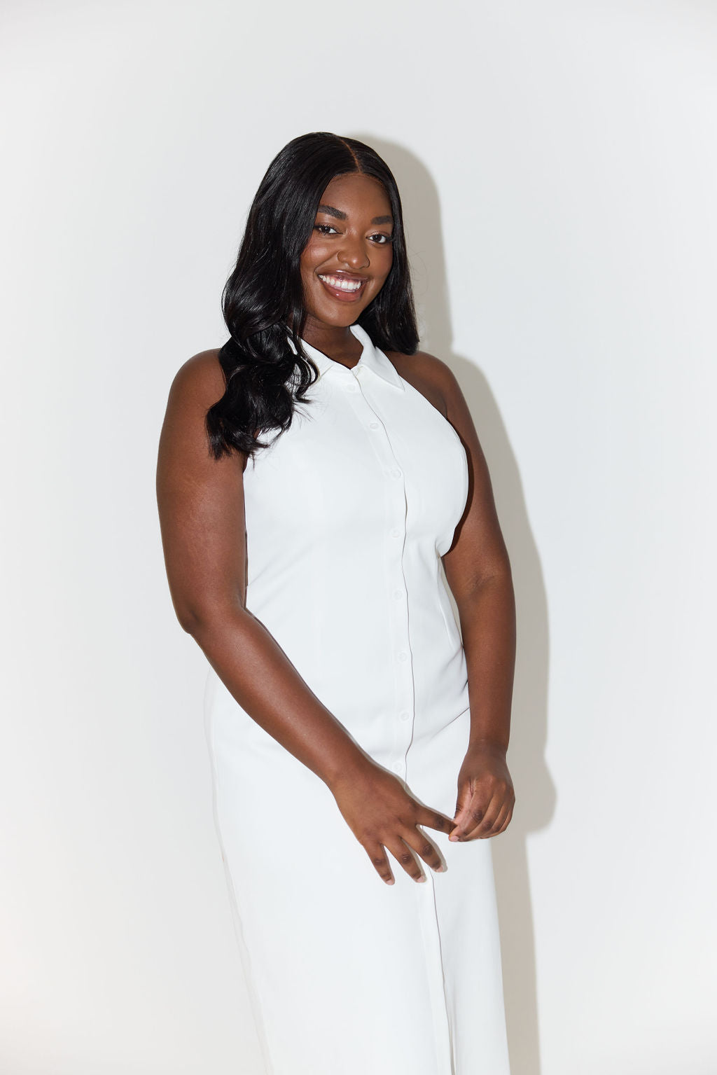 La elegancia atemporal se encuentra con el diseño moderno en esta impresionante maxi-jurk, diseñada para resaltar tu belleza en cualquier ocasión. Con un profundo V-escote que acentúa la neckline y un estilo sin mangas, este modelo es perfecto para eventos veraniegos, celebraciones nocturnas o cualquier momento especial. Hecho de una mezcla de poliéster de alta calidad, este vestido no solo es sofisticado, sino también cómodo y práctico, ideal para la mujer contemporánea que busca un estilo chic y funcional.